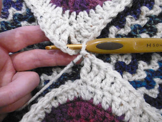 Round 1: Black Denim or chosen base colour, ch4, counts as a sc and ch3 corner, sc, ch1, then repeat following 3 more times, sc, ch3, sc, ch1, on the final corner sl st, into the ch4 of beginning. Pull yarn through st, and carry through this first section.