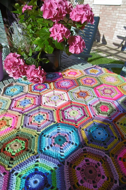 a flower centre...with a second round of hex's all in the same colour way but no flower just the circle hex, then a third round of 12 hex's in random colours making 19 hex's in all.